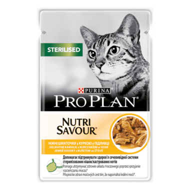 PRO PLAN® STERILISED NUTRISAVOUR®. Консервований порційний повнораціонний корм для дорослих стерилізованих котів, з куркою. Шматочки у підливці. 85 г.