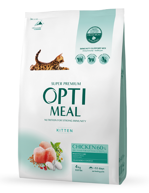 - Сухий корм Optimeal Кіттен для кошенят захищає травну систему завдяки балансу кальцію, фосфору та вітаміну групи D.