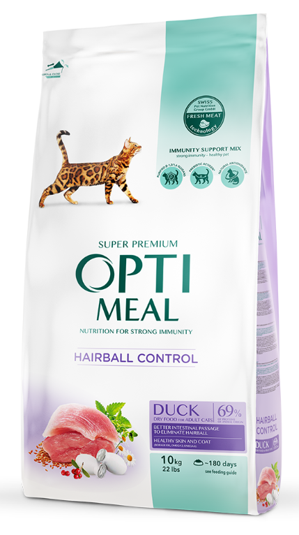 Optimeal Adult Cat Duck Hairball Control - якісний сухий раціон для дорослих котів, спеціально розроблений для усунення шерстяних клубочків. Цей унікальний корм Оптиміл виготовлений зі свіжого качиного фаршу, що забезпечує вашого пухнастого друга високоякісним та легкозасвоюваним тваринним білком. Харчування поєднує в собі високу якість і доступну ціну.