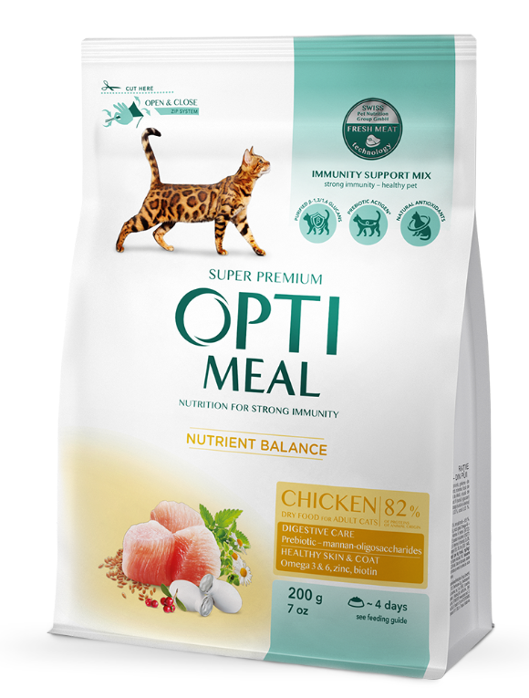 - Сухий корм Оптиміл Едалт Кет Чікен для котів має зручну форму та оптимальну текстуру гранул, це сприяє ефективному очищенню зубів.