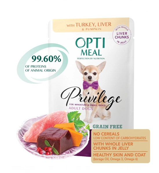 - Свіже м'ясо індички та цілі шматочки печінки забезпечують собаку високоякісним легкозасвоюваним протеїном тваринного походження.