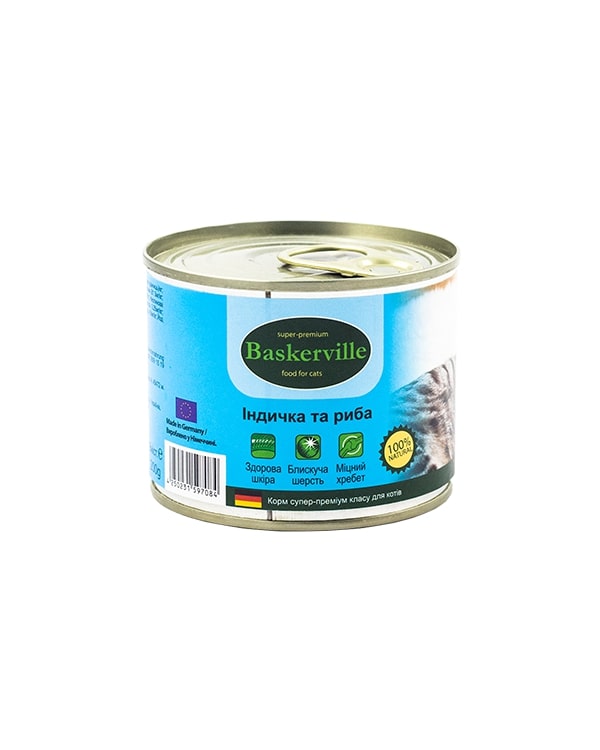 Консерви для котів "Baskerville з м'ясом індички і риби" це унікальне поєднання як смакових так поживних якостей для вашого маленького гурмана.