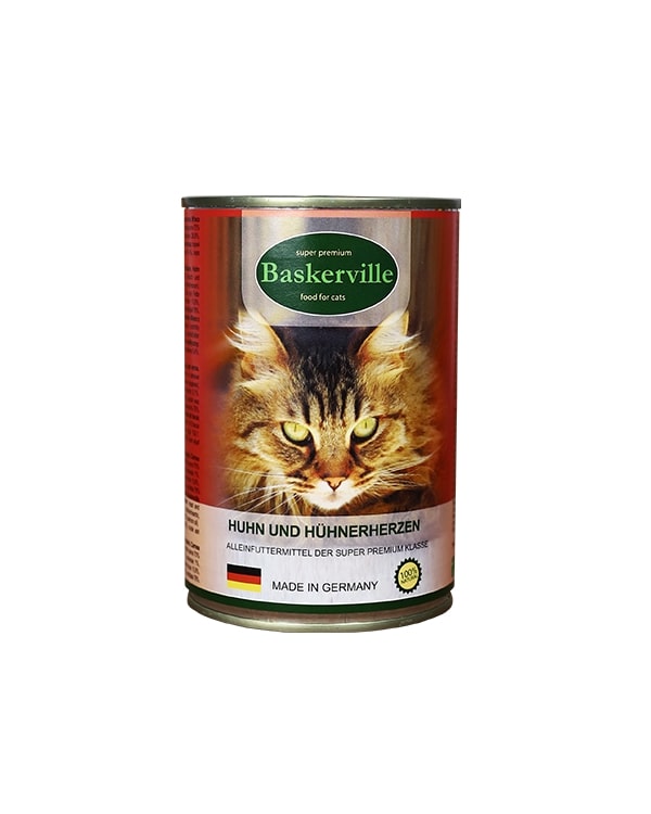 Консерви для котів "Baskerville з м'ясом курки та сердечками" - це добірні шматочки курки та курячі серця, приготовані без додавання антибіотиків та хімічних добавок.