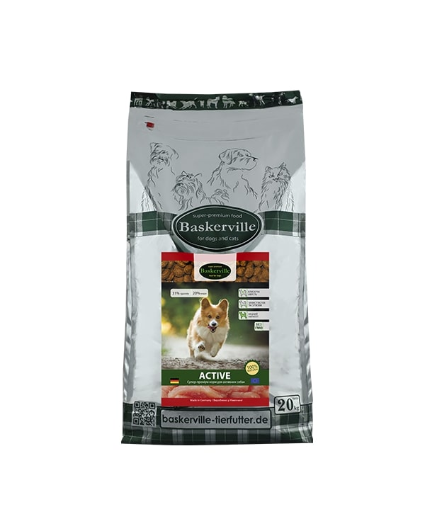 Сухий корм для активних собак супер преміум класу Baskerville Active. Спеціальне харчування для активних собак. Даний корм підвищує продуктивність вашого собаки в період інтенсивної діяльності, збільшуючи надходження високоякісних білків, жирів та багатих поліненасичених жирних кислот.