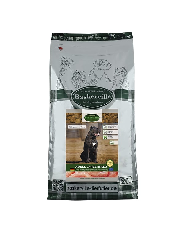 Сухий корм для собак великих порід супер преміум класу Baskerville має спеціально збалансований склад для міцного здоров'я дорослим собакам великих порід. Забезпечує відмінний стан шкіри, а спеціальні добавки сприяють формуванню густого та блискучого вовняного покриву.