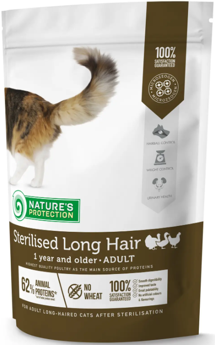 Nature's Protection Sterilized Longhair Adult - це повноцінний корм для дорослих котів після стерилізації (від 1 року і старше). Завдяки збалансованому вмісту жиру в кормі, корм особливо підходить для стерилізованих довгошерстих котів, які схильні набирати занадто багато ваги.