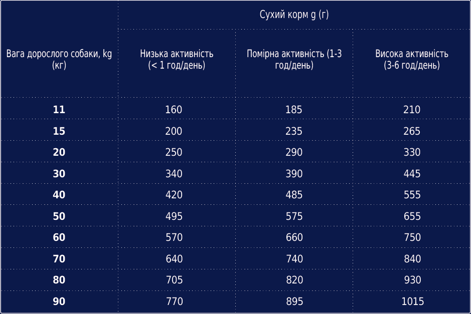 Корм необхідно вводити в раціон поступово (принаймні протягом перших 5-ти d (днів)). Забезпечте тварині постійний доступ до чистої свіжої питної води. Індивідуальні норми годування можуть змінюватися, залежно від віку, породи, рівня активності та середовища перебування тварини.