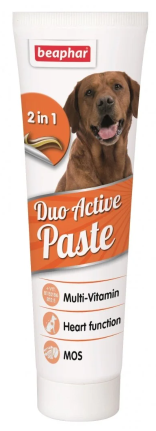 Харчова добавка для собак у вигляді двокольорової пасти, яка виконує 2 функції - насичення організму необхідними вітамінами і формування здорової кишкової мікрофлори. Комбінація полівітамінної та кондиціонуючої пасти має комплексну позитивну дію на організм, та покращує самопочуття собаки. Особливо рекомендується давати пасту тварині після прогону гельмінтів, хвороби або прийняття антибіотиків, оскільки вона допомагає швидше відновитися. Полівітамінна (жовта) паста містить всі вітаміни і мінерали, які потрібні собаці для підтримки його здоров’я і доглянутого вигляду. Вітаміни, які містить паста дуже добре впливають на вигляд шерсті, а L-карнітин зміцнює мускулатуру собаки. Жирні кислоти Омега-6 важливі для підтримки здорового стану шкіри, росту шерсті, виробництва червоних кров’яних тілець, прискореного загоєння ран і підвищення опірності організму тварини інфекційним захворюванням. Паста також містить кальцій, природним джерелом якого є молоко, тому він дуже легко засвоюється організмом собаки. Кондиціонуюча (коричнева) паста містить додаткові мінерали і БІО-МОС (маннан олігосахариди). БІО-МОС абсорбує токсичні речовини з організму і активно стимулює формування здорової кишкової мікрофлори у собаки.