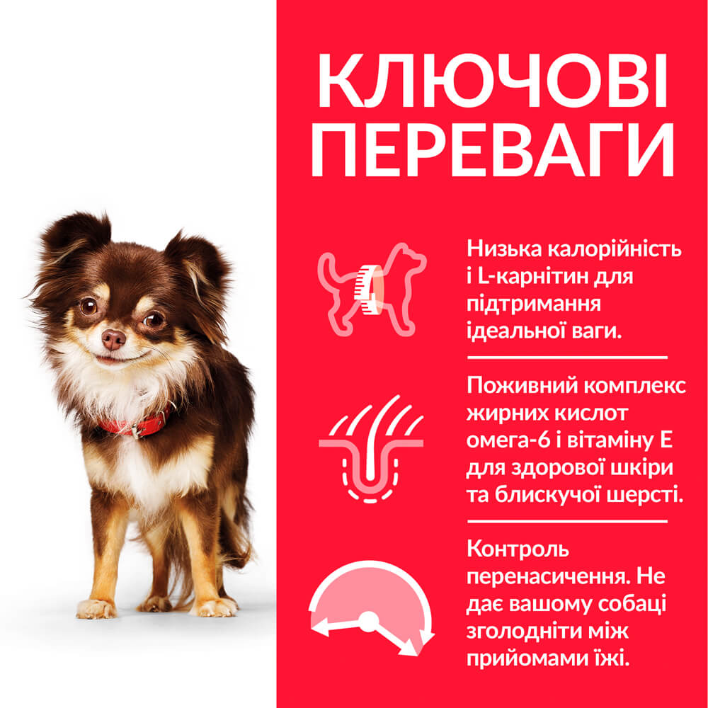 • На 15 % менше калорій, ніж у харчуванні Hill's Science Plan для дорослих собак