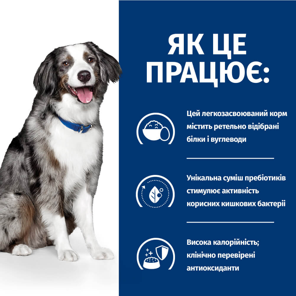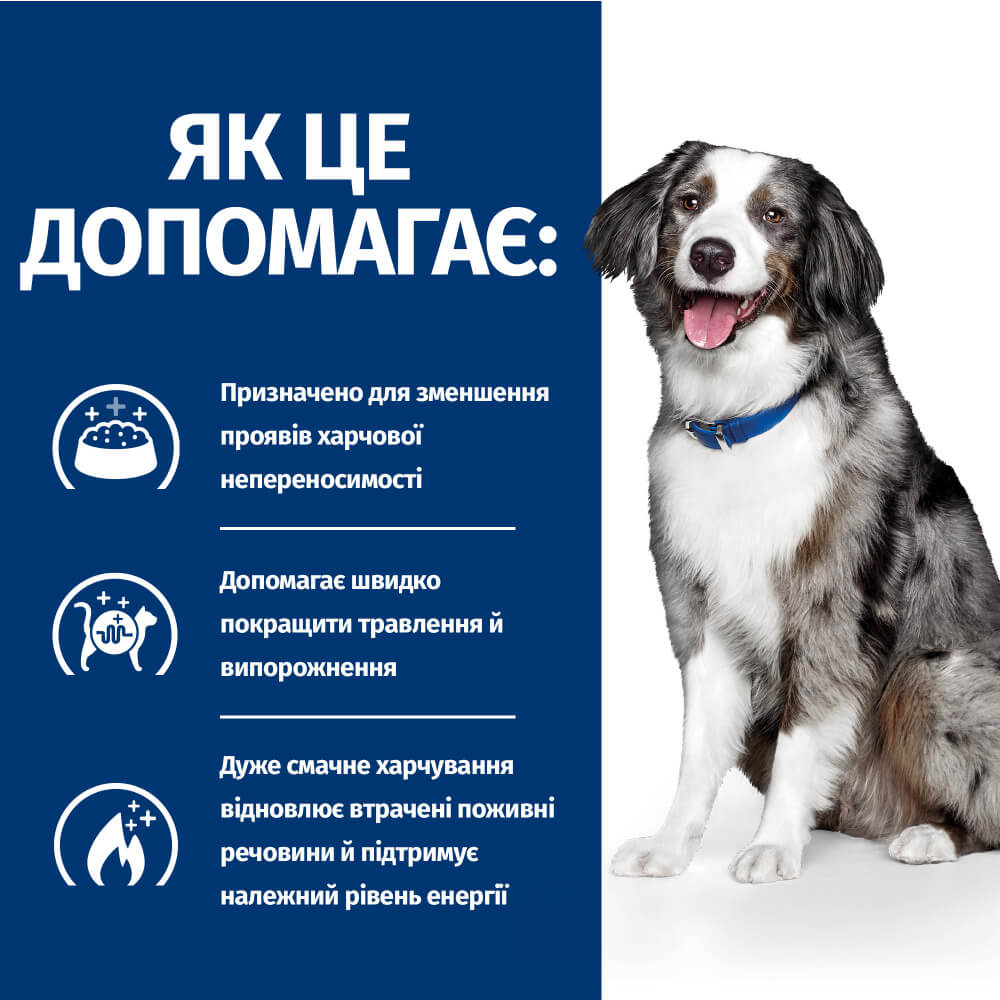 Сухий корм для собак Hill’s Prescription Diet i/d Sensitive з яйцем і рисом – повнораціонне легкозасвоюване дієтичне харчування, спеціально розроблене дієтологами і ветеринарними лікарями, щоб покращити самопочуття собак при чутливості до певних компонентів їжі та розладах травлення. Харчування нормалізує роботу травного тракту і сприяє кращому засвоєнню поживних речовин. Завдяки малому переліку інгредієнтів знижується імовірність виникнення чутливості до їжі.