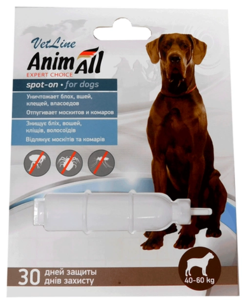АнімАлл ВетЛайн Спот-Він краплі від бліх і кліщів для собак від 40 до 60 кг Склад: 1 мл препарату містять діючі речовини: перметрин - 25%, імідаклоприд - 10%, піріпроксіфен - 2%. Фармакологічна дія: AnimAll VetLine СПОТ ОН для собак - комбінований інсектоакарицидної препарат, який застосовується для профілактики і лікування собак при хворобах, викликаних ектопаразитами: блохами (Ctenocephalides canis, Pulex Irritans); вошами (Linognathus setosus); волосоїдів (Trichodectes canis); паразітіформнимі кліщами (Ixodes spp, Hyalomma spp, Dermacentor spp, Haemaphysalis spp, Rhipicephalus spp, Boophilus calcaratus); коростявими кліщами (Sarcoptes canis); вушними кліщами (Otodectes cynotis). Одноразова обробка препаратом захищає тварин від ураження блохами і кліщами протягом 4-х тижнів. Застосування: Препарат наносять на неушкоджену, суху шкіру. Утримуючи тюбик-піпетку вертикально, відламати наконечник. Розділити шерсть тварини і нанести препарат безпосередньо на шкіру між лопатками біля основи шиї. При обробці великих тварин препарат наносити на шкіру в 3-4 місцях уздовж хребта, від холки до хвоста. Загибель паразитуючих на тварині комах після обробки відбувається протягом 12 годин, загибель або відкріплення кліщів - протягом 48 годин. Після одноразової обробки тварини, репеллентное дію засоби триває до 4 тижнів. Повторні обробки при необхідності проводять 1 раз на місяць. Протипоказання: Підвищена чутливість до компонентів препарату! Не застосовувати препарат цуценятам у віці до 9 тижнів і / або масою тіла до 1,5 кг! Не застосовувати препарат хворим, виснаженим і старим тваринам! Чи не застосовувати котам! Застереження: При обробці тварин уникати потрапляння препарату в очі, на слизові оболонки, в ротову порожнину. Не допускати контакту тільки що оброблених тварин з іншими тваринами. Після обробки тварин препаратом не дозволяти їм купатися у водоймах протягом 48 годин. Зберігання: Зберігати в упаковці виробника, в сухому, недоступному для дітей та тварин місці, окремо від харчових продуктів і кормів, при температурі від 5 до 25 град С. Застосування: Препарат застосовують зовнішньо безпосередньо на шкіру в місцях, недоступних для злизування (ділянка холки і вздовж хребта). Дозування залежить від маси тварини: Маса собаки Доза препарату від 1,5 кг до 4 кг 0,8 мл від 4 кг до 10 кг 2,0 мл від 10 кг до 20 кг 4,0 мл від 20 кг до 30 кг 6,0 мл від 30 кг до 40 кг 8,0 мл від 40 кг до 60 кг 10,0 мл При терапії алергічного дерматиту, викликаного блохами препарат можна використовувати в поєднанні з іншими лікарськими засобами. AnimAll VetLine Spot-On доцільно застосовувати вагітним і годуючим самкам, тим самим захищаючи годувальницю і цуценят. Перед застосуванням препарату на вагітних і лактуючих самках, проконсультуйтеся з ветеринарним лікарем! Препарат залишається ефективним, навіть якщо шерсть тварини намокне, однак тривалого знаходження тварини в воді рекомендується уникати, з метою запобігання зниженню ефективності обробки. Якщо тварина необхідно викупати з шампунем - рекомендується використання шампунів торгової марки AnimAll за 3 дні до застосування VetLine Spot-On. Термін придатності 3 роки. Виробник: Animall