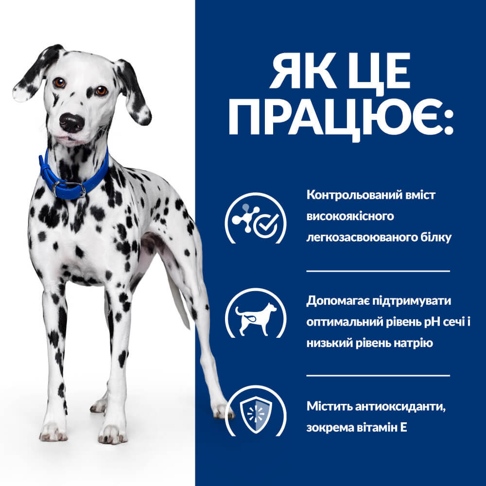 Сухий корм для собак Hill’s Prescription Diet u/d – повнораціонне дієтичне харчування Hill's Prescription Diet u/d, спеціально розроблене дієтологами та ветеринарними лікарями, призначене для собак, в чиєму організмі утворюються уратні чи цистинові уроліти (камені в сечовивідних шляхах, частіше в сечовому міхурі). Такі порушення проявляються різними ознаками, серед яких часте сечовипускання, кров у сечі, напруження під час сечовипускання та біль у животі. Деякі види каменів можна спочатку видалити фізично (часто оперативним втручанням), а потім дотримуватися правильного харчування, щоб зменшити ризик їхнього повторного утворення.