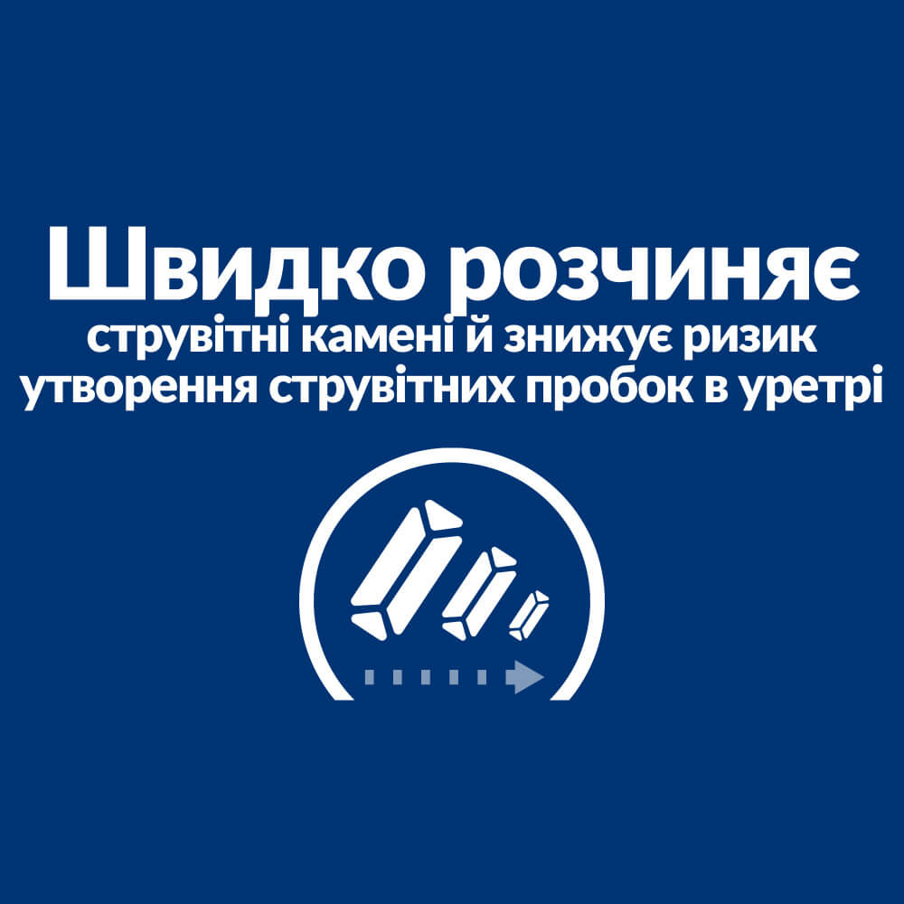 • Клінічно доведено, що при споживанні цього корму струвітні камені розчиняються вже за 6 днів (середній термін розчинення становить 13 днів)¹.