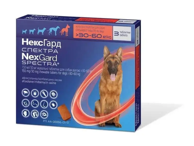 НЕКСГАРД СПЕКТРА 30-60 кг (ХL) від бліх, кліщів та гельмінтів (упаковка 3 табл.)