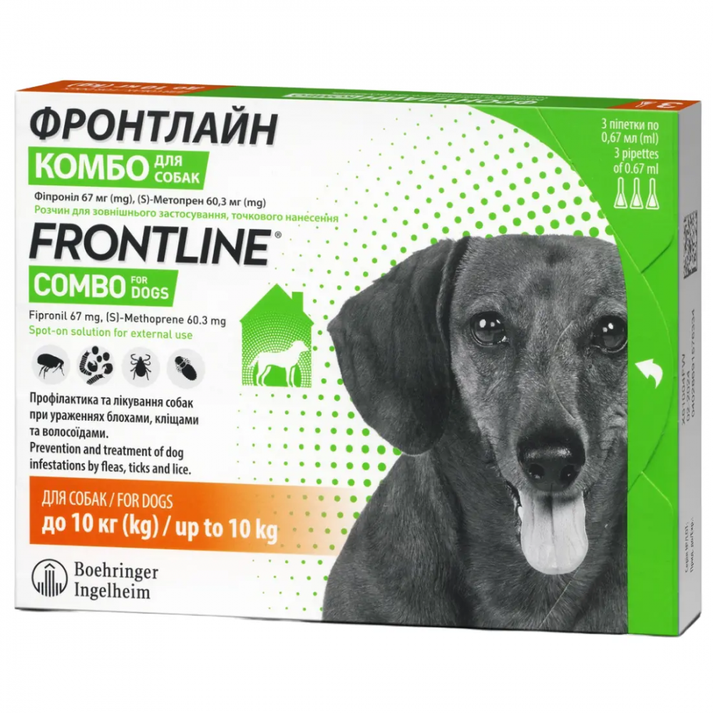 Краплі Берінгер Інгельхайм Фронтлайн Комбо від бліх і кліщів для собак, S (до 10 кг)Boehringer Ingelheim (Берінгер Інгельхайм) Фронтлайн КомбоЗагальні положенняДля собак вагою до 10кг.«Фронтлайн Комбо Спот Он»- інсектоакарицидний препарат, що містить в якості діючої речовини фіпроніл (C12H4CL2F6N4OS) і S-метопрен, а також допоміжні речовини і розчинники .«Фронтлайн Комбо Спот Он»представляє собою безбарвну прозору рідину зі слабким специфічним запахом. Випускають «Фронтлайн Комбо Спот Он» у формі 10% розчину для топікального (точкового) нанесення, розфасованим по 0,5; 0,67; 1,34; 2,68; і 4,02 мл в поліетиленові піпетки з відламуючим кінчиком, поміщені по 1 штуці в упаковці, на якому вказані назва фірми-виробника і її товарний знак, об'єм, призначення і склад препарату, номер серії, дата виготовлення. Кожен блістер упакований в картонну коробку. Кожну коробку маркують із зазначенням назви фірми-виробника і її товарного знака, об'єму, призначення та складу препарату, номера серії, дати виготовлення, терміну придатності, умов зберігання, написи: «Для тварин» ідодають інструкцію із застосування. Зберігають препарат в заводській упаковці, в сухому захищеному від світла, недоступному для дітей та тварин місці, окремо від харчових продуктів і кормів, при температурі від 0 до 35 ° С. Термін придатності препарату - 3 роки з дня виготовлення.Фармакологічні властивостіФіпроніл, що входить до складу препарату блокує рецептори ГАМК паразита і має виражену інсектицидну і акарицидну дію відносно вошей, бліх, волосоїдів та кліщів (іксодові, хейлітелли, отодектоси ), що паразитують на собаках і кішках, препарат ефективний на всіх стадіях розвитку паразитів. «Фронтлайн Комбо Спот Он" не є препаратом системної дії, він накопичується в епідермісі і сальних залозах тварини івиявляє контактну інсектоакарицидну дію на ектопаразитів. «Фронтлайн Комбо Спот Он» протягом 24 годин поступово розподіляється по всій поверхні тіла і забезпечує захист тварин від ектопаразитів, тривалість захисту тварин від кліщів: у котів - 15 - 21 день, у собак - 1 місяць. Тривалість захисту тварин від бліх: у котів - 1,5 місяця, у собак - 2 - 2,5 місяці. Повторні обробки тварин проводять по закінченню вказаних термінів. «Фронтлайн Комбо Спот Он» за ступенем впливу на організм відноситься до групи малонебезпечних речовин - згідно з ГОСТ 12.1.007.76, що невиявляє шкірно-резорбтивної, сенсибілізуючої, ембріотоксичної, тератогенної і мутагенної дії. При попаданні в очі викликає слабке подразнення.Порядок застосуванняПрепарат «Фронтлайн Комбо Спот Он» застосовують для боротьби з блохами , вошами, волосоїдами та кліщами (іксодові, хейлітелли, отодектоси) собак і котів, шляхом топікального (точкового) нанесення препарату на шкіру. Перед обробкою у піпетки відламують кінчик, розсовують у тварини шерсть в області спини (між лопатками) і, натискаючи на піпетку, наносять препарат на шкіру в одну або кілька точок.Препарат«Фронтлайн Комбо Спот Он »застосовують для лікування отодектоза (вушної корости). З цією метою закапують в кожне вухо по 4 - б крапель (краплі обов'язково вводять в обидва вуха). Для рівномірного розподілу препарату вушну раковину складають навпіл і злегка масажують її основу, залишок нанести на шкіру між лопаток (однократна обробка). Препарат «Фронтлайн Комбо Спот Он" не дозволяється застосовувати цуценятам і кош