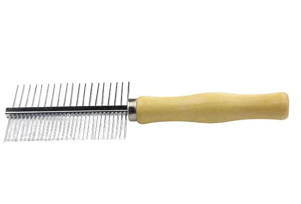 Гребінець двосторонній густий/рідкісний зуб. 5,2*17,2см Сталевий двосторонній гребінець ідеально підходить для щоденного розчісування вовни. Робить волосся м'яким, гладким і блискучим. Допомагає знаходити і запобігає утворенню ковтунів і місць проживання бліх і паразитів. Закруглені кінчики не пошкодять шкіру Вашої тварини. Виготовлена із сталі. Дерев'яна ручка Видаляє мертві шерсть та бруд.