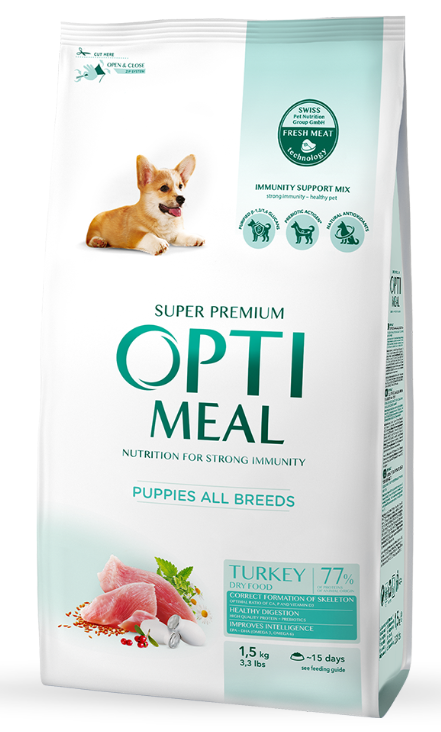 Optimeal Puppies All Breeds - це сухий раціон з м’ясом індички для цуценят всіх порід.
